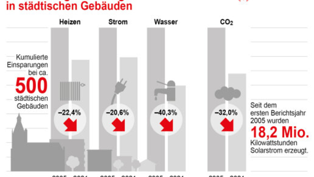 Wir haben zudem ein intensives Energie-Controlling für unsere rund 660 Gebäude. So haben wir zwischen 2005 und 2018 mehr als 570 energiesparende Maßnahmen in unseren Objekten umgesetzt. Aus den daraus gewonnenen Kennwerten erstellen wir jährlich für das Vorjahr einen Energiebericht. Darin dargestellt ist die Verbrauchsentwicklung der städtischen Gebäude für Heizenergie, Strom und Wasser. Ebenso weist der Energiebericht auch die durch bauliche Energiesparmaßnahmen erzielten Einsparungen aus.