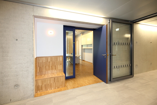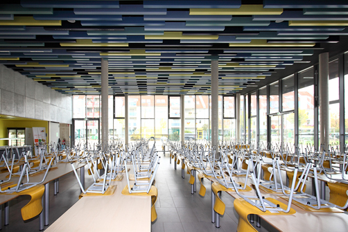Wir hatten bei der Erweiterung des Gymnasiums zudem die Vorgabe, ein Gebäude im Passivhausstandard zu errichten. Dies ist bei einem Schulbau eine besondere Herausforderung. Die erforderliche Dämmung haben wir hinter einer Fassade aus Fliesen und Aluminium "versteckt". Die Holz-Aluminiumfenster sind dreifach verglast und haben einen innenliegenden Sonnenschutz. Die Frischluftzufuhr der Klassenräume wird durch eine Lüftungsanlage gewährleistet.