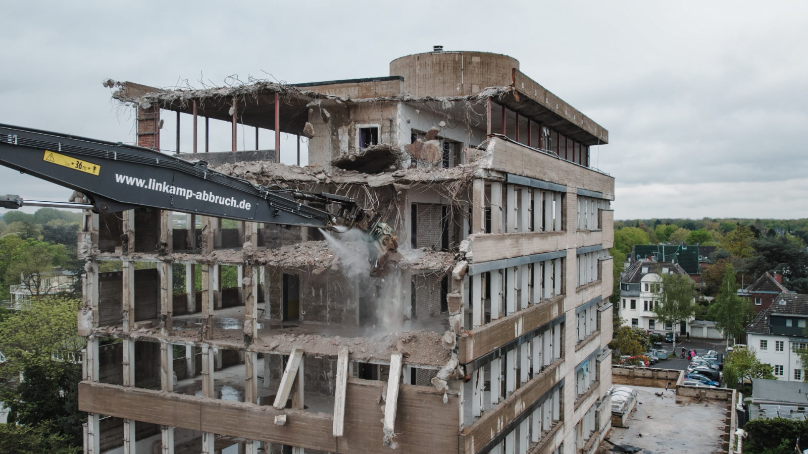 In Phase eins haben wir eine Schadstoffsanierung durchgeführt. Danach setzten wir einen "Knabberbagger" ein, um den Rohbau des Bestandsgebäudes oberirdisch abzubrechen. Aufgrund der sehr beengten Platzverhältnisse handelte es sich dabei um einen Langarm-Knabberbagger mit besonders großer Reichweite. Er "knabberte" den Bauschutt mit einer hydraulischen Schere auf eine Kantenlänge von 30 bis 40 Zentimetern klein. Vor allem bei Betonteilen kann dies zu Staubentwicklungen führen. Dabei entstanden allein beim Abbruch der Fassade rund 100 Tonnen Schutt, welchen wir vorübergehend in das Untergeschoss verfüllten. Ein Teil des Schuttes der alten Fassade wird für die Wiederverwertung der neuen Fassadenelemente vorbereitet.
