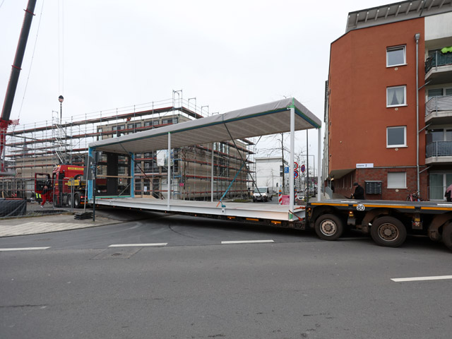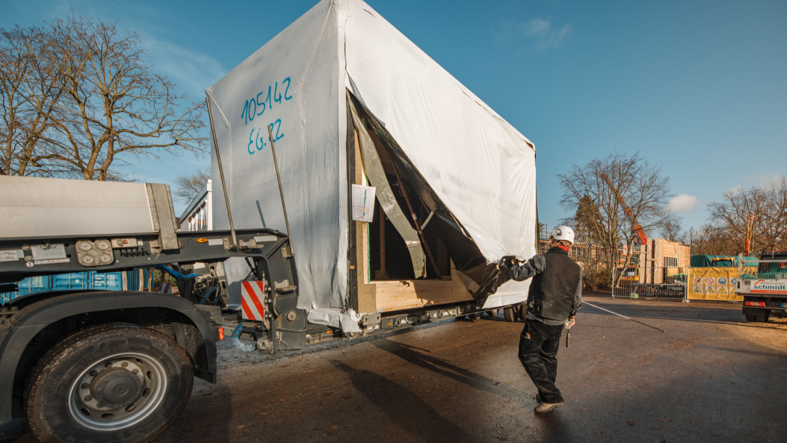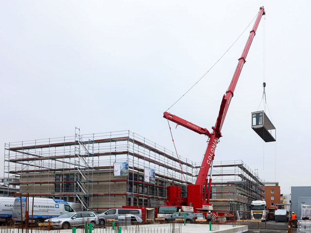 Ein Raummodul wird mit den Kran herunter gelassen© Stadt Köln / Martina Goyert