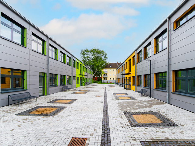 Im Jahr 2023 haben wir vier Schulstandorte in Modulbauweise erweitert, drei davon in Holzmodulbauweise. Für die Grundschule an der Nußbaumerstraße 254 haben wir einen Holzmodul-Neubau mit Mensa sowie fünf Räume für verschiedene Zwecke, Sanitäranlagen sowie die Offene Ganztagsnutzung fertiggestellt. Der Neubau wurde barrierefrei und klimaschonend in Anlehnung an die Passivhausbauweise sowie mit einem Gründach realisiert.