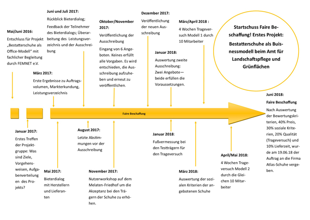 2018 beschaffte das Amt für Landschaftspflege und Grünflächen 250 Paar Sicherheitsschuhe für Bestattungsgehilfen. Vor der Ausschreibung haben wir gemeinsam mit FEMNET e. V. einen Bieterdialog zur fairen Vergabe von Schutz- und Arbeitsschuhen durchgeführt. Dabei wurden den potenziellen Anbieter*innen die neuen Anforderungen an soziale und ökologische Kriterien vorgestellt.