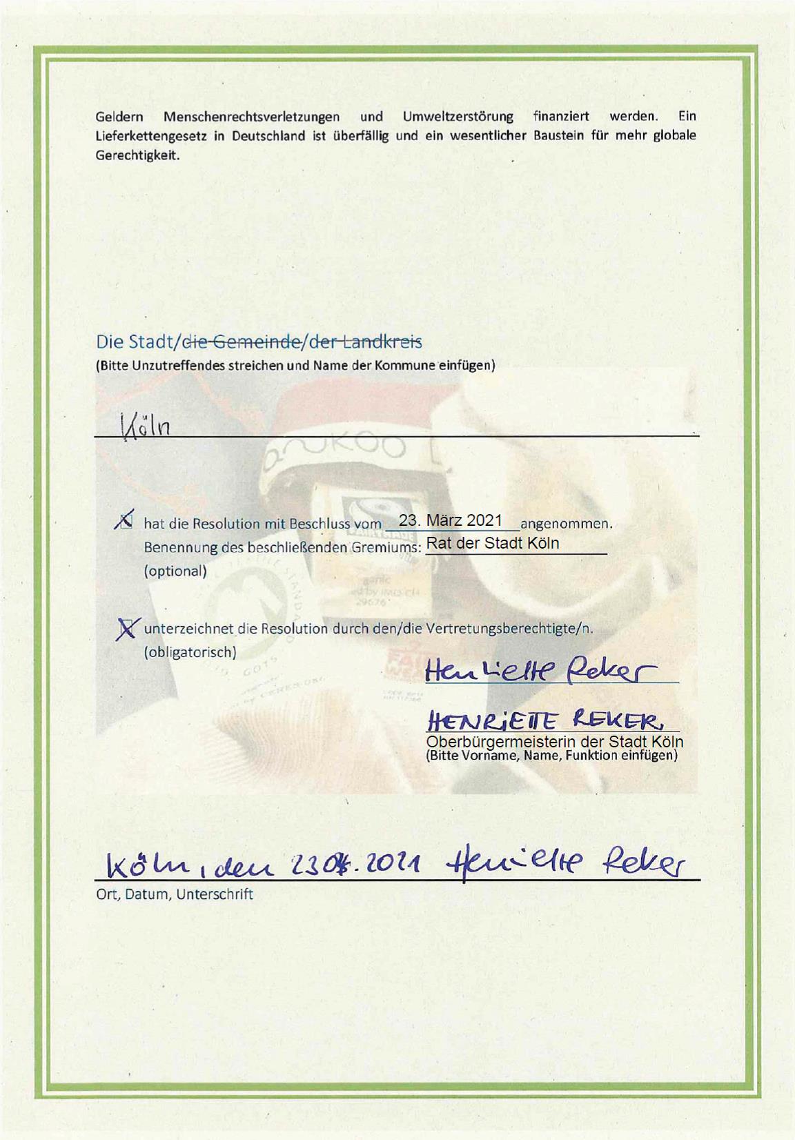 Als Fair Trade Town und Hauptstadt des Fairen Handels setzen wir - wie mittlerweile viele deutsche Kommunen - verstärkt auf eine faire, sozial- und ökologisch vertretbare, nachhaltige Beschaffung. Mit Unterzeichnung der Resolution "Kommunen für ein starkes Lieferkettengesetz" durch Oberbürgermeisterin Henriette Reker unterstützen wir die Forderung nach einem starken Lieferkettengesetz für jedes ökonomische Handeln in Deutschland. Vorausgegangen war ein Beschluss des Rates vom 23. März 2021.