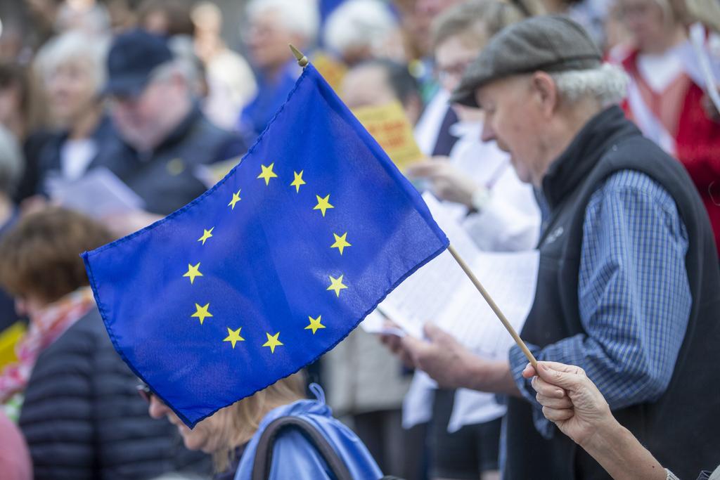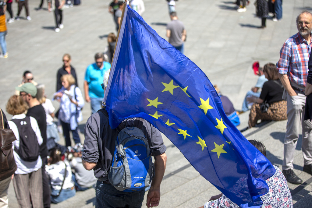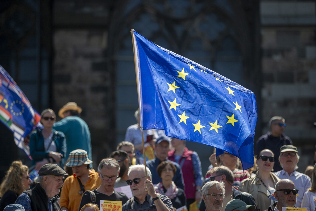 Kölner*innen singen die Europahymne auf der Domtreppe am 9. Mai