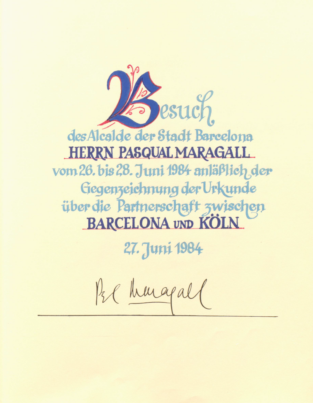 Die Städtepartnerschaft zwischen Köln und Barcelona wurde am 30. März 1984 in der Hauptstadt der spanischen autonomen Gemeinschaft Katalonien gegründet. Die Gegenzeichnung der Urkunde erfolgte am 27. Juni 1984 in Köln.