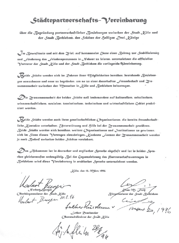 Gemäß der Städtepartnerschafts-Vereinbarung beruhte die Gründung dieser Partnerschaft auf der Motivation, einen Beitrag zur Förderung des Friedensprozesses im Nahen Osten auf kommunaler Ebene zu leisten. Beim Besuch unserer Delegation in Bethlehem wurde diese Vereinbarung am 20. August 1996 gegengezeichnet.