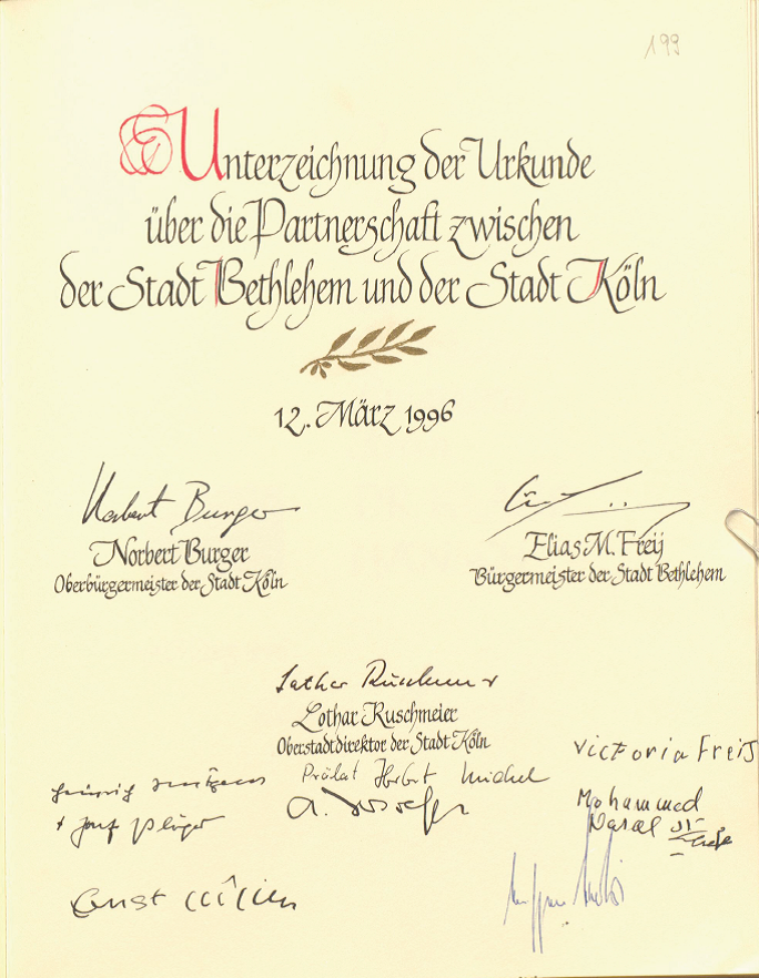 Auf Vermittlung von Hans-Jürgen Wischnewski (1922 bis 2005, ehemaliger Bundes- und Staatsminister) wurde die Städtepartnerschaft Köln-Bethlehem am 12. März 1996 geschlossen. Der gut vernetzte Nahost-Kenner nutzte den Aufenthalt von Bürgermeister Elias M Freij in Deutschland, um den Kontakt nach Köln zu knüpfen.