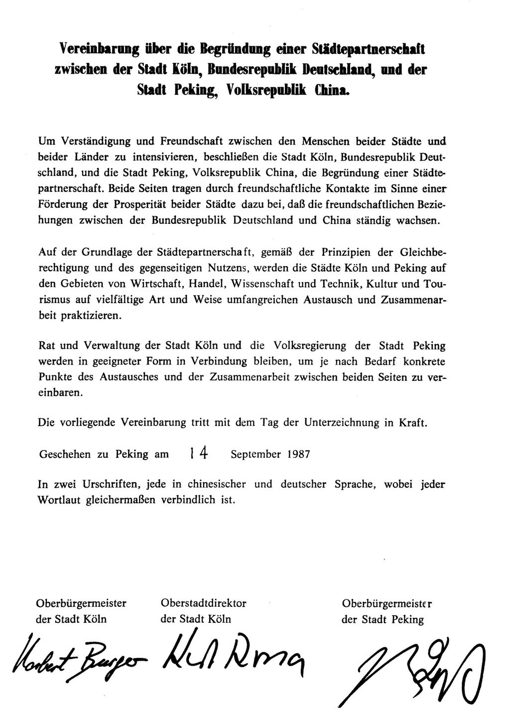 Als wir am 14. September 1987 offiziell die Partnerschaft mit Peking (Beijing) eingingen, schlossen wir die dreizehnte internationale Verbindung. Wir setzten damit einen weiteren, zukunftsorientierten Meilenstein in unserer internationalen Ausrichtung. Die Städtepartnerschaft Köln-Peking ist nach Kyoto (1963) die zweite, die mit einer Kommune im asiatischen Raum geschlossen wurde.