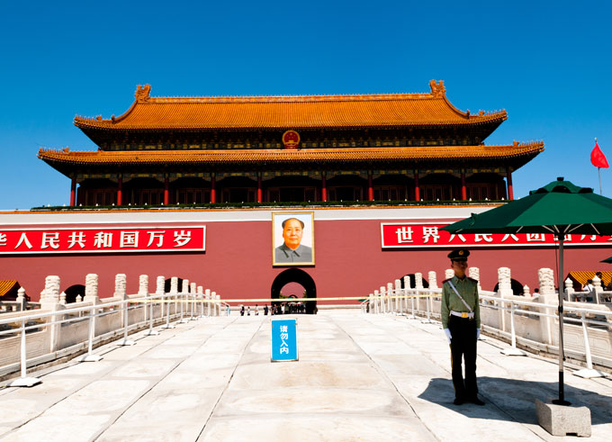 Er liegt unmittelbar südlich der Verbotenen Stadt und markiert das Zentrum Pekings. Mit seiner Fläche von 40 Hektar ist er der größte öffentliche Platz der Welt. Traurige Berühmtheit erlangte er im Juni 1989, als die friedlichen Demonstrationen für mehr Freiheit, Demokratie und Reformen des Staatswesens durch das Eingreifen des Militärs blutig niedergeschlagen wurden. - Die Große Halle des Volkes