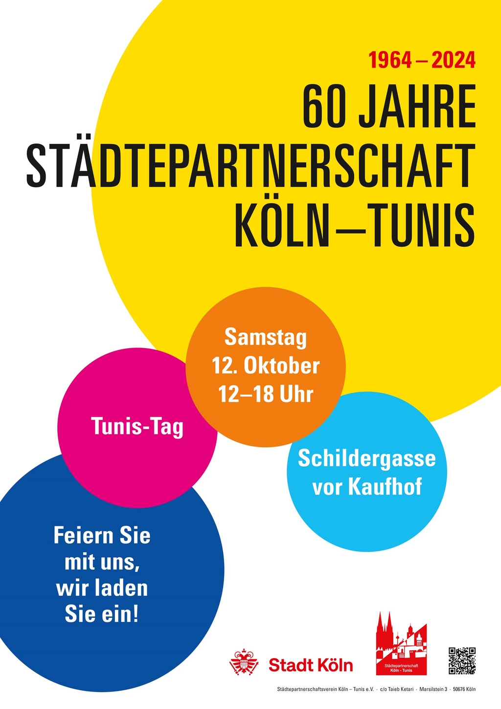 Anlässlich dieses runden Geburtstags lud der Städtepartnerschaftsverein Köln-Tunis alle Kölner*innen am 12. Oktober 2024 zum "Tunis-Tag" in der Innenstadt ein. Der Verein informierte über seine Arbeit und die nordafrikanische Partnerstadt.
