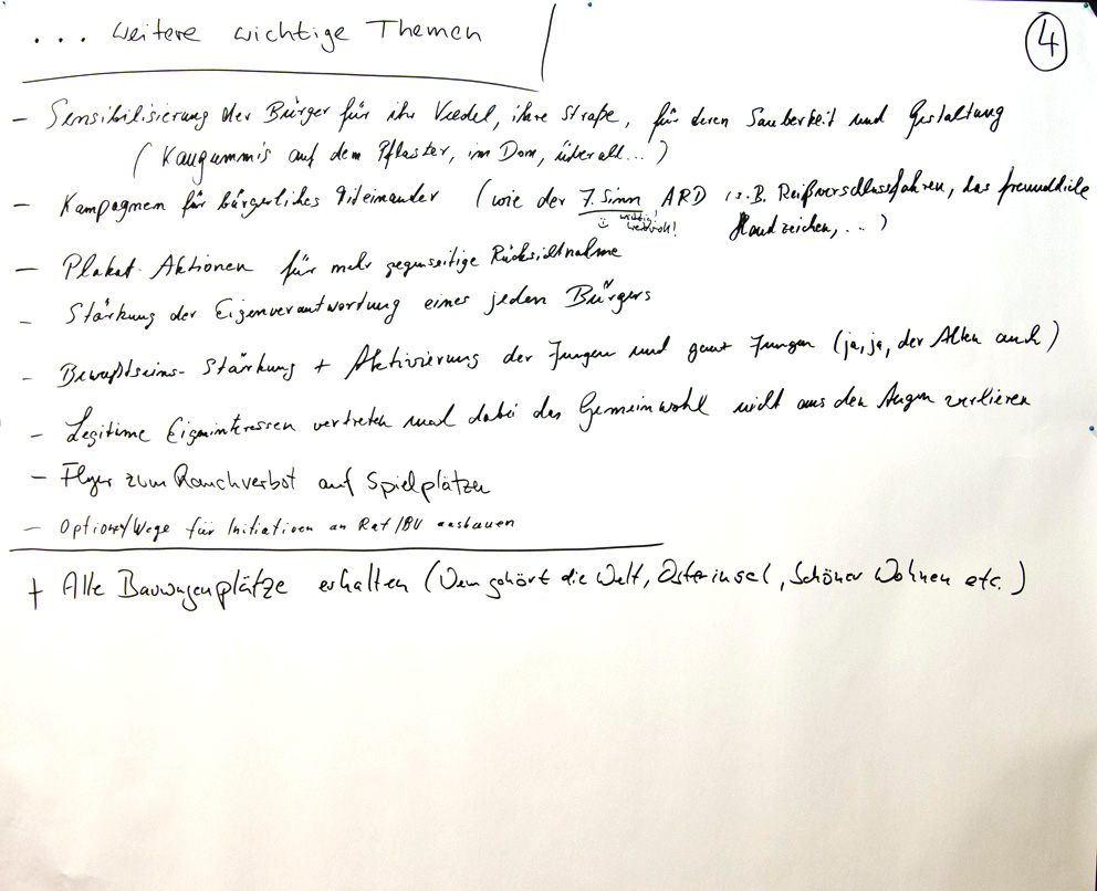 Neben speziellen Fragestellungen rund um das Thema "Bürgerbeteiligung" waren die Anwesenden auch aufgerufen, ganz konkrete Anliegen an der Stellwand "Weitere wichtige Themen" niederzuschreiben. Eine Liste mit Antworten und Maßnahmen zu den zusammengetragenen Punkten können Sie am Ende der entsprechenden Rubrik herunterladen.