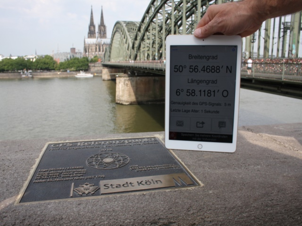 Wer sich unterwegs mit einem GPS-Empfänger (GPS = Global Positioning System) orientiert, kann dessen Genauigkeit jetzt in Köln kostenlos abgleichen und überprüfen. Ob oder wieviel das eigene Navigationsgerät, das Smartphone oder der sonstige GPS-Empfänger von den präzisen Koordinaten des GPS-Referenzpunktes abweicht, lässt sich ab sofort auf der rechtsrheinischen Terrasse der Hohenzollernbrücke in Köln-Deutz feststellen. Das Amt für Liegenschaften, Vermessung und Kataster der Stadt Köln hat die Koordinaten des neuen Kölner GPS-Referenzpunktes mit einem hochpräzisen GPS-Empfänger mehrfach bestimmt, mit einer Genauigkeit von ein bis drei Zentimetern. Der Messpunkt und die zugehörigen Koordinaten wurden anschließend in eine Bronzeplatte gegossen und in die Mauer am Reiterstandbild eingelassen. Exakt an der Stelle mit den Koordinaten 6°58,1161’ östliche Länge und 50°56,4666’ nördliche Breite befindet sich nun der geodätische Referenzpunkt.