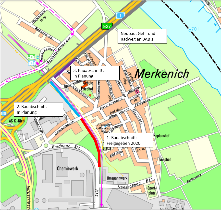 Der Neubau dieses Weges stellt den ersten Bauabschnitt einer neuen Verbindung von der Emdener Straße zur Leverkusener Brücke dar. Im zweiten Bauabschnitt wird eine Verbindung von der Causemannstraße zum Spoerkelhof geschaffen. Im Rahmen des Neubaus der Rheinbrücke der BAB 1 wird im dritten Bauabschnitt eine neue Geh- und Radwegrampe vom Spoerkelhof zum südlichen Geh- und Radweg der Autobahnbrücke gebaut (siehe Anlage). Die begleitenden Geh- und Radwege an der noch neu zu bauenden Rheinbrücke der BAB 1 werden von 2,00 bzw. 2,50 Metern auf der Bestandsbrücke auf beidseitig je 3,25 Meter auf der neuen Brücke verbreitert. In Richtung Innenstadt ist die Sanierung der Radverkehrsanlagen entlang der Emdener Straße geplant. Ziel ist es, spätestens mit der Fertigstellung der Leverkusener Brücke, die derzeit für 2024 vorgesehen ist, eine komfortable und lückenlose Geh- und Radwegverbindung zwischen Merkenich und der Bundesautobahn 1 fertig gestellt zu haben.