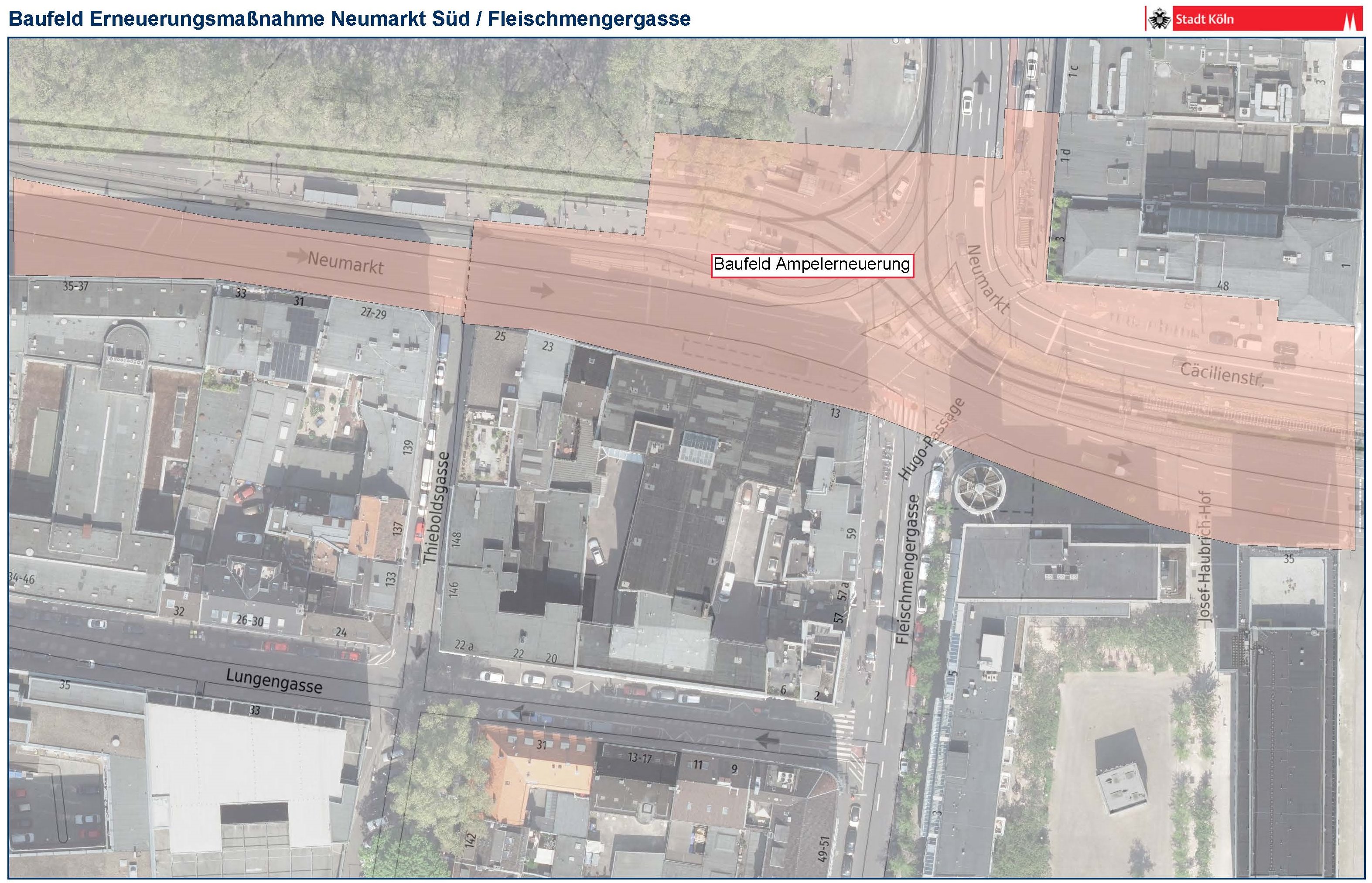Die Arbeiten finden schwerpunktmäßig im Bereich zwischen Neumarkt Hausnummer 35 bis 37 (Lichthaus Remagen) und der Cäcilienstraße Hausnummer 48 (Höhe Kunsthaus Lempertz/VHS-Studienhaus) im Fahrbahnbereich sowie auf den angrenzenden Geh-wegen und Radverkehrsanlagen statt.