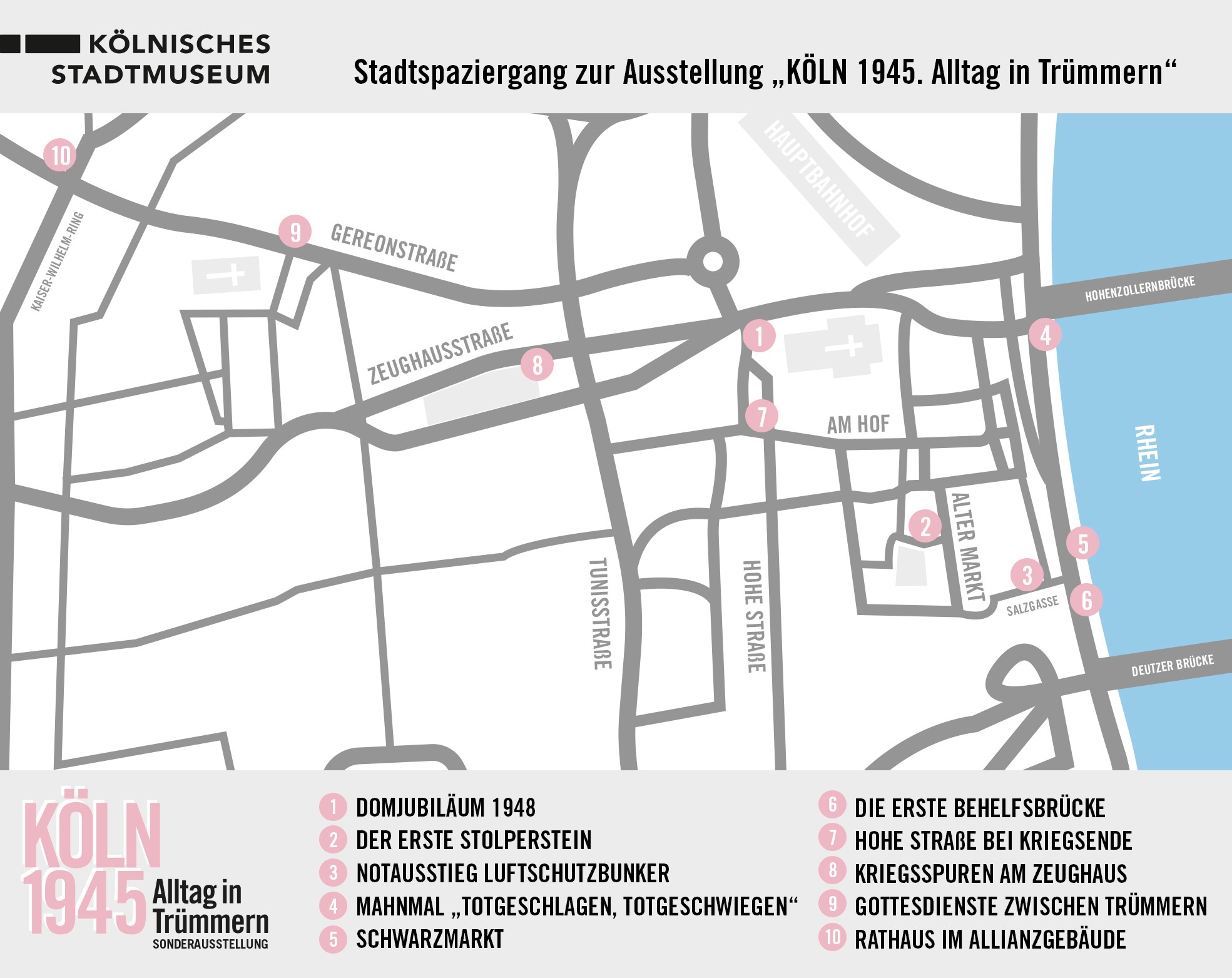 Direkt vor Ort machen die DIN-A3-großen Aushänge auf vergangene Ereignisse und bleibende Kriegsspuren aufmerksam – und ermöglichen direkte Vergleiche des heutigen und damaligen Stadtbildes. Wie sah die direkte Domumgebung 1945/46 aus? Wo blühte der Schwarzmarkt? Welche Straßen wurden zuerst von den Trümmermassen befreit? Wo finden sich im Stadtbild noch immer Einschusslöcher aus dem Zweiten Weltkrieg oder Überreste von Luftschutzbunkern?