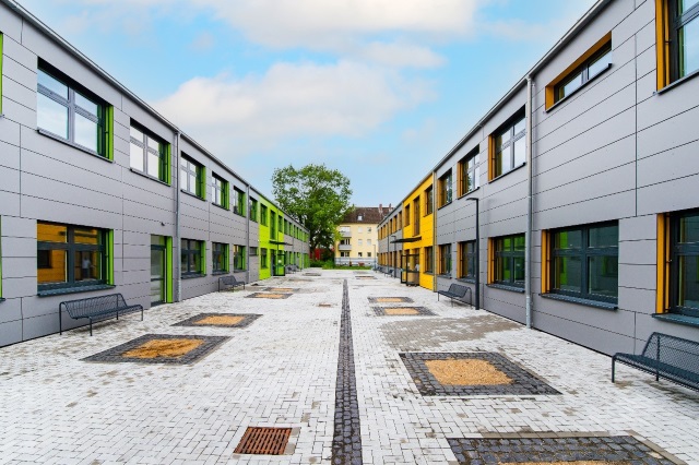 Nachdem bereits im Januar 2021 die neue Mensa in Stahlmodulbauweise in Betrieb genommen wurde, konnten die Schülerinnen und Schüler der Grundschule Porz Hauptstraße pünktlich zum neuen Schuljahr ihre neuen Unterrichtsräume beziehen. Zwei moderne Schulgebäude in Stahlmodulbauweise wurden innerhalb von rund einem Jahr auf dem Schulhof nahe dem Bestandsgebäude errichtet. Die Grundschule aus den 1950er-Jahren, ein dreigeschossiger Bau mit Flachdach sowie einem stillgelegtem Lehrschwimmbecken, befindet sich in einem baulich schlechten Zustand. Hauptgebäude und die alte Turnhalle sollen abgebrochen und neu gebaut werden. Die notwenigen Räumlichkeiten für eine Auslagerung der Schule konnten auf einem Teil des großzügigen Schulhofbereiches realisiert werden, sodass der Schulbetrieb am jetzigen Standort in der Hauptstraße 432 weiter aufrechterhalten werden kann.