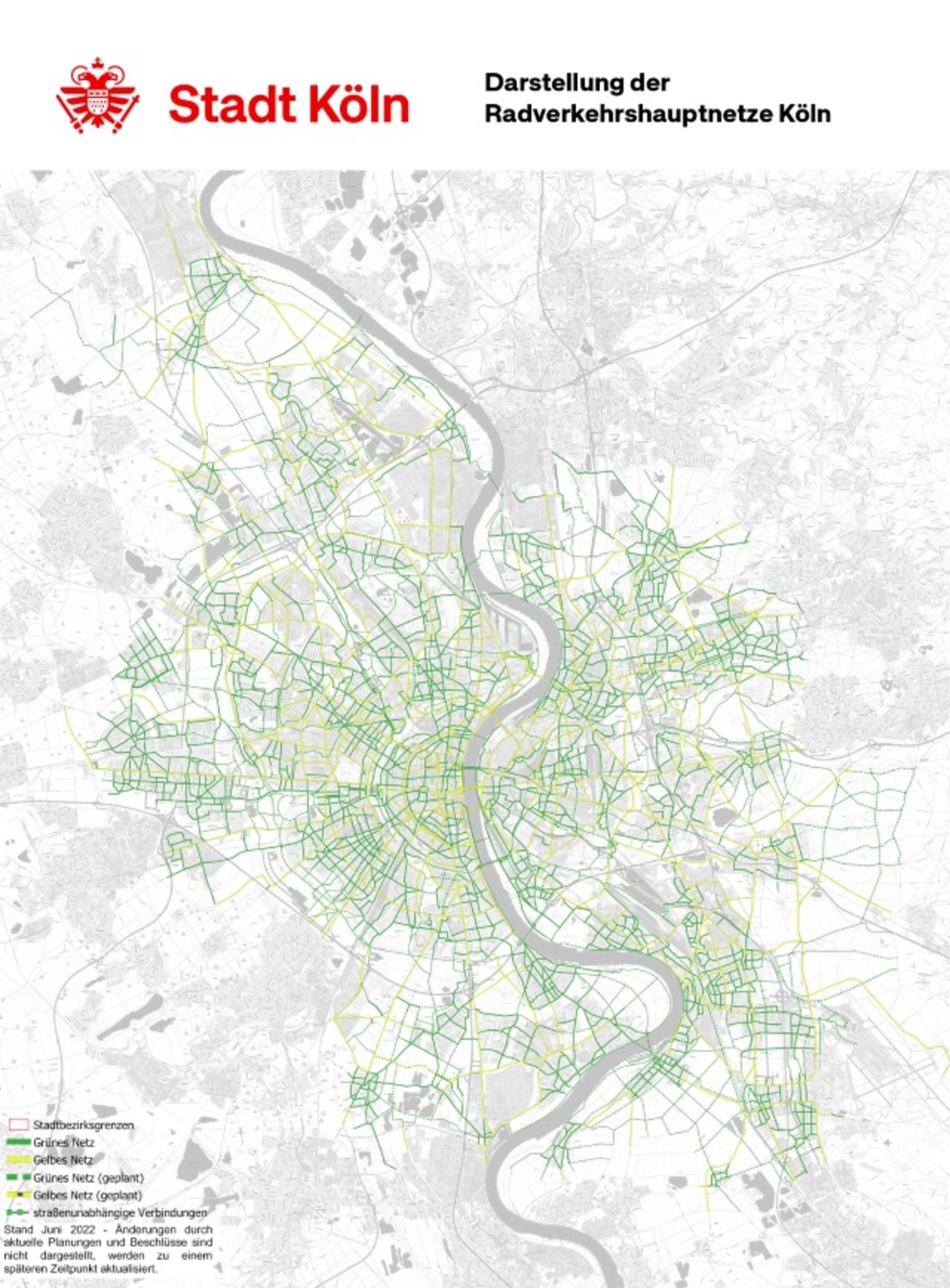 Ohne Autobahnen hat das Kölner Straßennetz 2.800 Kilometer. Das beschlossene Radhauptnetz hat eine Länge von 1.800 Kilometern. Davon sind rund 500 Kilometer Teil des gelben Netzes (mit Radinfrastruktur), rund 1.300 Kilometer sind Teil des grünen Netzes. Im grünen Netz werden rund 400 Kilometer straßenunabhängig geführt (beispielsweise Wege in Grünanlagen), rund 100 Kilometer sind zudem noch in Planung. Damit umfasst das straßengeführte Rad-Hauptroutenzielnetz eine Länge von rund 1.300 Kilometern und insgesamt rund 46 Prozent des Kölner Straßennetzes.