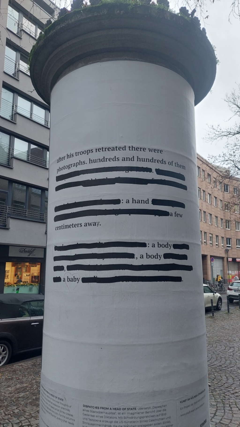 Für die Kunstsäulen in Köln wählte Slinko "Bucha", eine Geschichte, die wie sie selbst sagt, "keiner Erklärung bedarf". Da der Krieg in der Ukraine noch andauert, ist dieses Projekt auch noch im Gange, und weitere Geschichten sind hier zu finden. Ein herzlicher Dank geht an die Mitglieder der Kunstsäulenjury, die in diesem Jahr mitgewirkt haben: Heike Ander, Johanna Reich, Rozbeh Asmani, Arno Hambloch, Christian Sievers und Damian Zimmermann sowie Nadine Müseler.