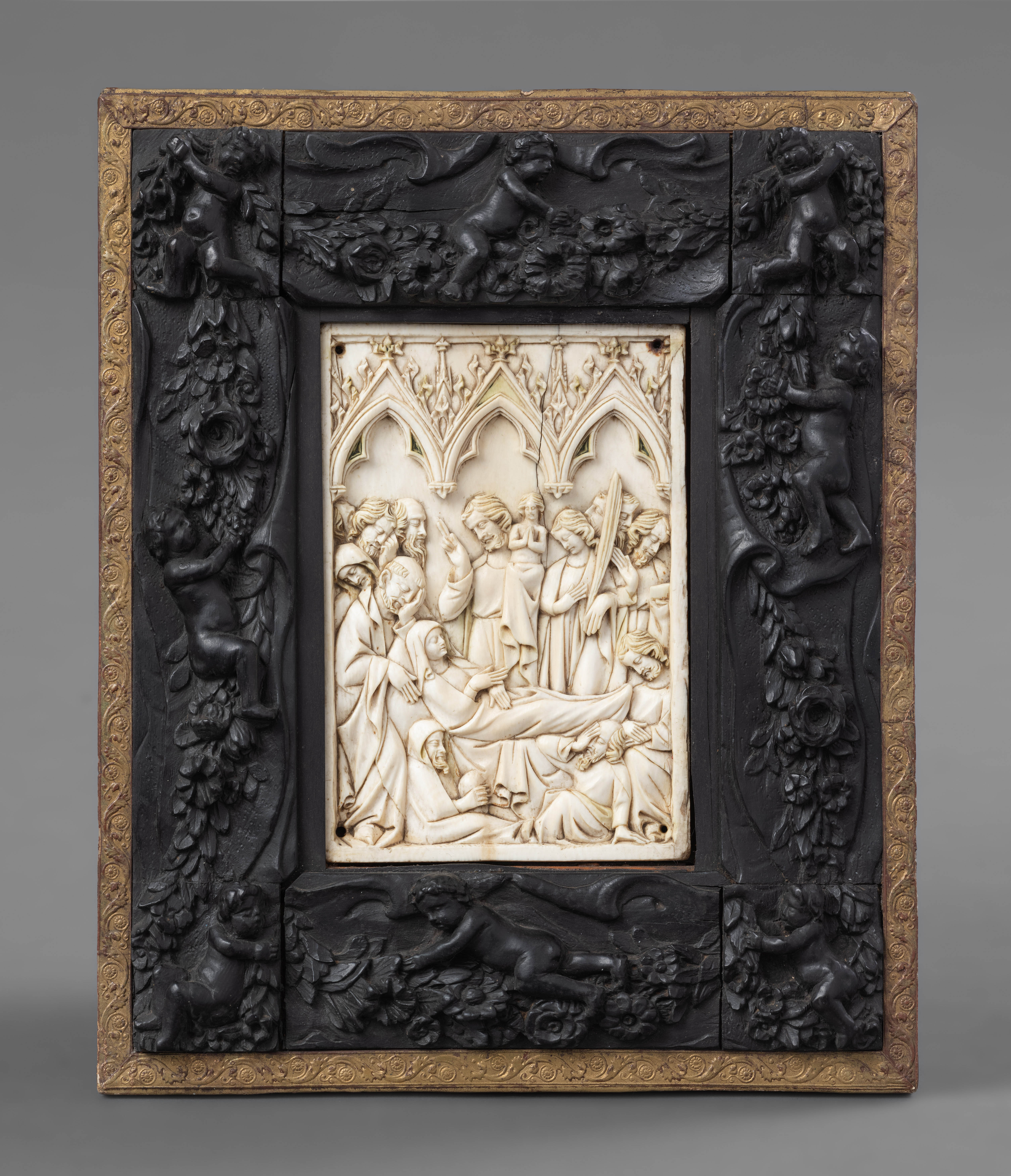 Die Szene wird von einer detailreichen gotischen Maßwerkarchitektur überdacht. Zusammen mit diesem einzigartigen Elfenbein wird aus derselben Sammlung auch ein entzückendes kleines Perlmuttrelief mit der Darstellung der Anbetung der Heiligen Drei Könige aus der Zeit um 1500 als Geschenk angenommen.
