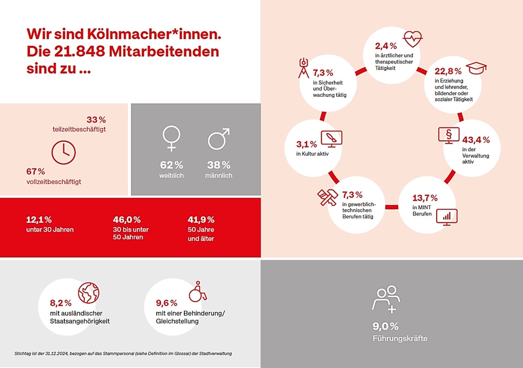 Die Anforderungen an eine moderne Stadtverwaltung verändern sich kontinuierlich – auch in Köln. Zum Stichtag 31. Dezember 2024 waren 21.848 Mitarbeiter*innen im Stammpersonal der Stadtverwaltung beschäftigt. Sie tragen mit ihrer Arbeit zur Umsetzung städtischer Aufgaben und zur Weiterentwicklung der Verwaltung bei.