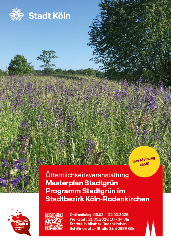 Ab 9. März 2026 ist die Meinung der Bürger*innen im Stadtbezirk Rodenkirchen gefragt, denn dann startet dort der Online-Dialog zum Masterplan Stadtgrün. Der Masterplan Stadtgrün dient der Sicherung und Weiterentwicklung der bestehenden Grüngürtel und Grünzüge sowie der Komplettierung der grünen Infrastruktur Kölns. Ziel ist es, das Stadtklima zu verbessern und die Aufenthalts- sowie Erholungsqualität der Grünflächen zu steigern. Die grün-blaue Infrastruktur sorgt für kühlere Temperaturen, erhält die biologische Vielfalt, begünstigt den natürlichen Wasserkreislauf und wertet das Stadtbild auf.