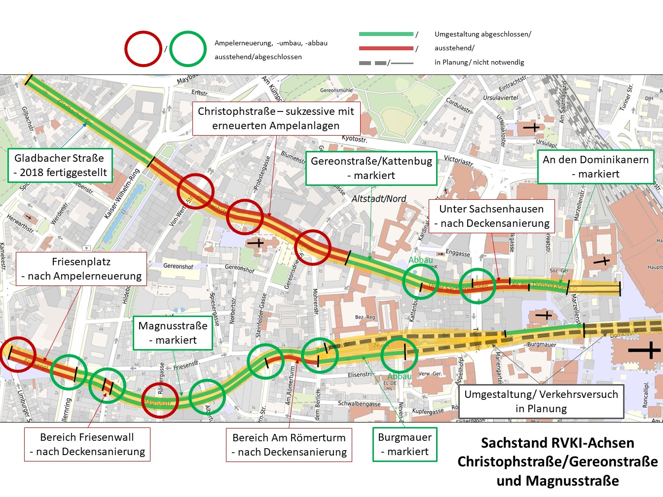 • Überwiegend Herstellung eines Radfahrstreifens mit einer Breite von 2,50 Meter (beinahe ausnahmslos auf der Achse Magnusstraße; auf der Achse Christophstraße zwischen Von-Werth-Straße und Börsenplatz), abschnittsweise Herstellung eines Radschutzstreifens (Achse Christophstraße zwischen Kaiser-Wilhelm-Ring und Von-Werth-Straße sowie zwischen Börsenplatz und Marzellenstraße)