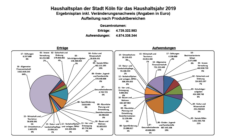 Im Jahr 2019 stehen den Aufwendungen von rund 4,874 Milliarden Euro lediglich Erträge von rund 4,739 Milliarden Euro gegenüber. Hierdurch ergibt sich ein Fehlbetrag von rund 135 Millionen Euro. In den Folgejahren verringert sich die Differenz zwischen Aufwendungen und Erträgen kontinuierlich. In den Jahren 2020 und 2021 reduzieren sich die Fehlbeträge bis auf rund 28 Millionen Euro. Im Jahr 2022 erreicht die Stadt erstmals wieder einen planerischen Überschuss von rund 3,4 Millionen Euro. Dieser – wenn auch geringe – Betrag zeigt, dass das Ziel der Verwaltung, im Jahr 2023 einen ausgeglichenen Haushalt vorzulegen, ein Jahr früher erreicht werden kann. Hierzu haben ein restriktives Ausgabeverhalten, die teilweise Schließung von Konnexitätslücken, aber auch die gute Wirtschaftslage in Köln wesentlich beigetragen. Die Fehlbetragsquote beträgt für das Haushaltsjahr 2019 2,58 Prozent, die mittelfristige Finanzplanung des Vorjahres ging noch von einer Quote von 4,39 Prozent aus.