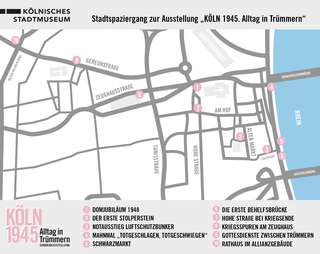 Ab sofort können alle Kölner*innen auf ihren Spaziergängen rund um die Altstadt analog Einblick in die pandemiebedingt geschlossene Sonderausstellung "KÖLN 1945. Alltag in Trümmern" nehmen. An vielen Stellen im Stadtraum – vor allem rund um Alter Markt, Dom und Rheinufer – finden Passant*innen jetzt Plakate, die mit besonderem Bildmaterial Wissenswertes aus der Ausstellung erzählen.