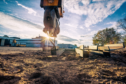 Mit 80 so genannten Verbauträgern, die senkrecht in die Erde eingebracht werden, wird die Grube abgestützt und gesichert. Der entstehende Trägerverband schützt sowohl die angrenzenden bestehenden Schulgebäude als auch den Erdwall mit den erhaltenswerten Bäumen entlang der Lückerather Straße. Die jeweils bis zu neun Meter langen Stahlträger wurden mit einer 16 Meter hohen Mobilramme in den Boden eingebracht. Sie sind das Grundgerüst für den so genannten Verbau, in dessen Rahmen die Baugrube ausgehoben wird. Noch in diesem Jahr soll der erste Beton für die Fundamente fließen.