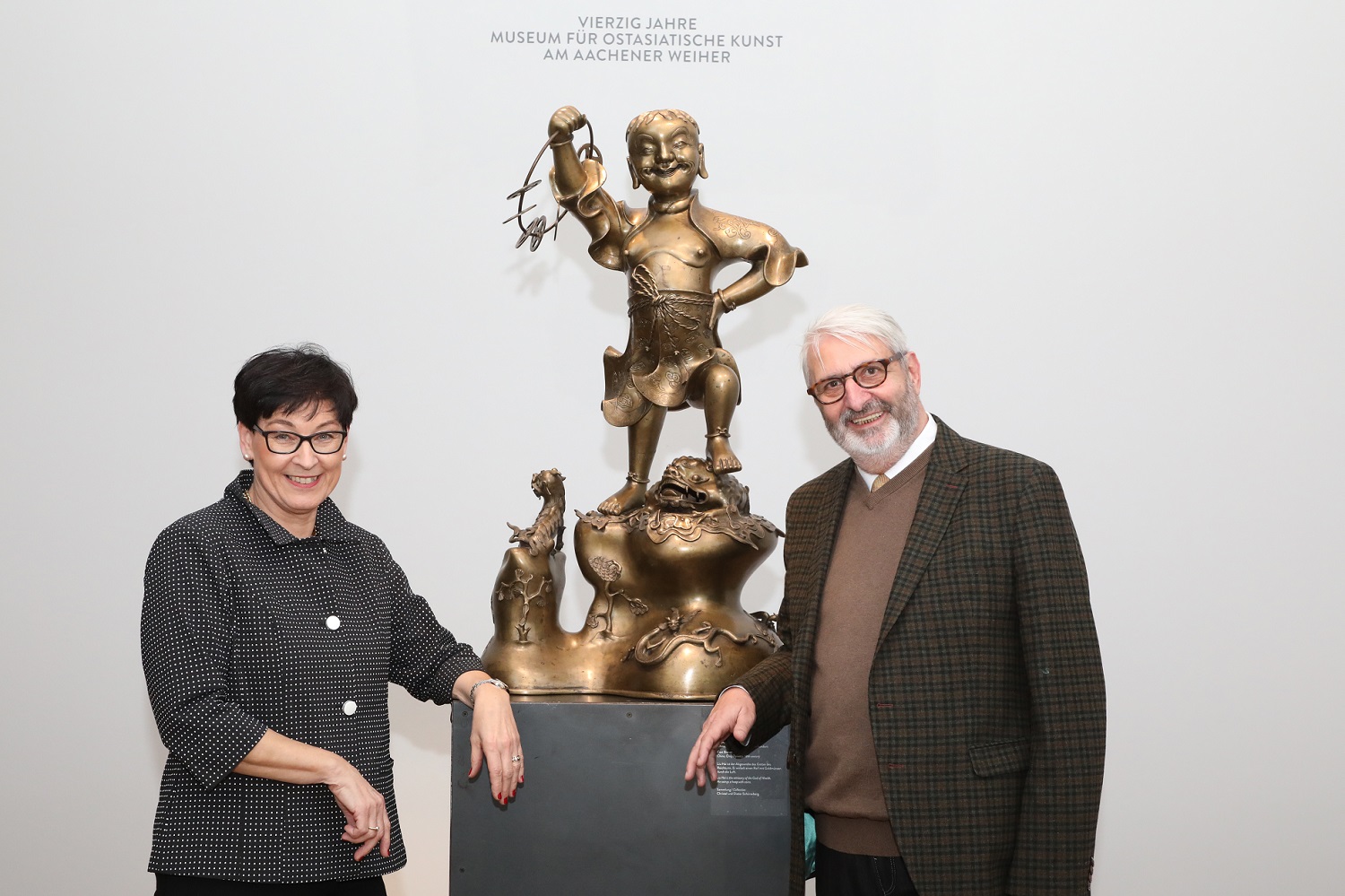 Das Sammlerehepaar Schürzeberg vor der Skulptur des daoistischen Unsterblichen Liu Hai" (im Museum für Ostasiatische Kunst Köln)