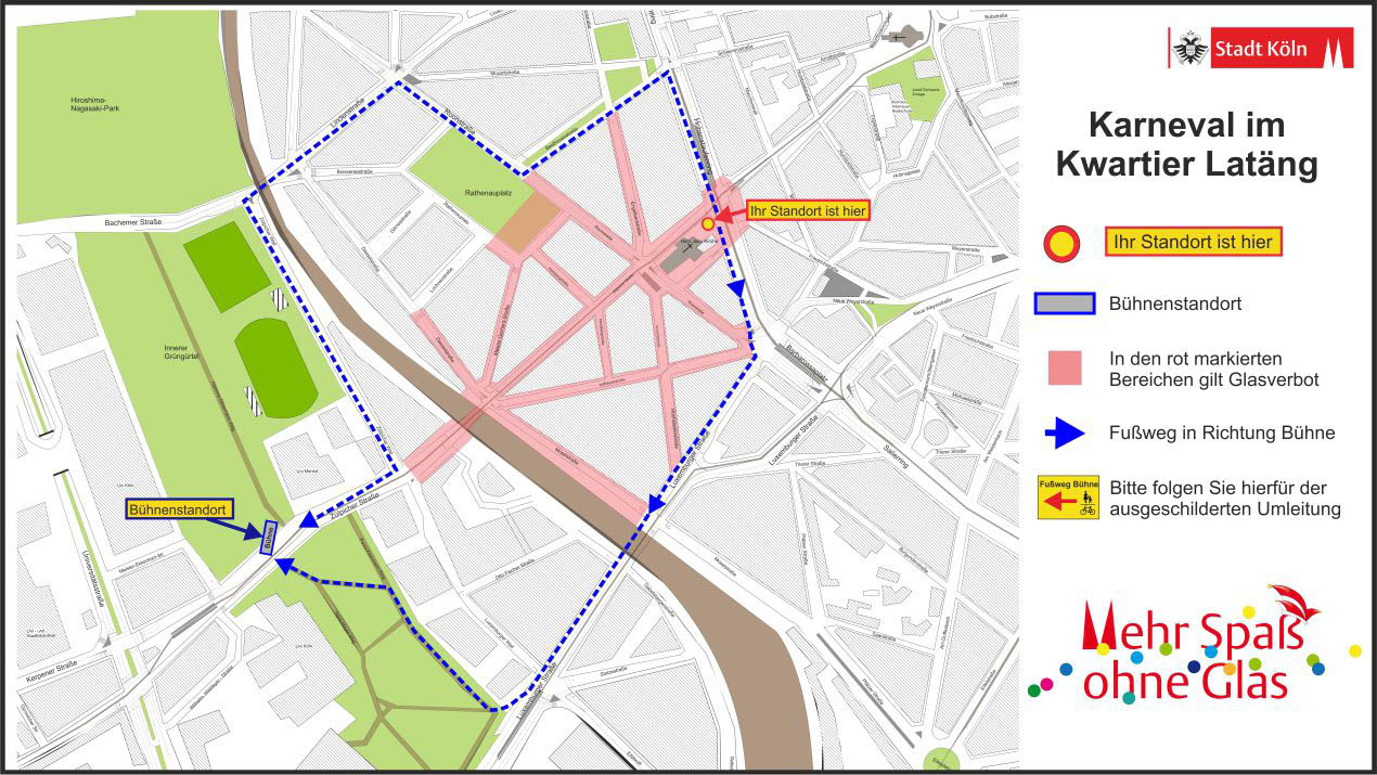 Erstmals bietet die Stadt Köln den "Jecken" im "Kwartier Latäng" an Weiberfastnacht ein kostenloses Bühnenprogramm. Die Initiative wurde im Rahmen des von Oberbürgermeisterin Henriette Reker einberufenen "Runden Tisches zum Kölner Karneval" entwickelt und soll dazu beitragen, die an den Karnevalstagen hochfrequentierte Zülpicher Straße zu entlasten. Die Schirmherrschaft über das Programm im Bereich der Uni-Mensa hat das Festkomitee Kölner Karneval übernommen.