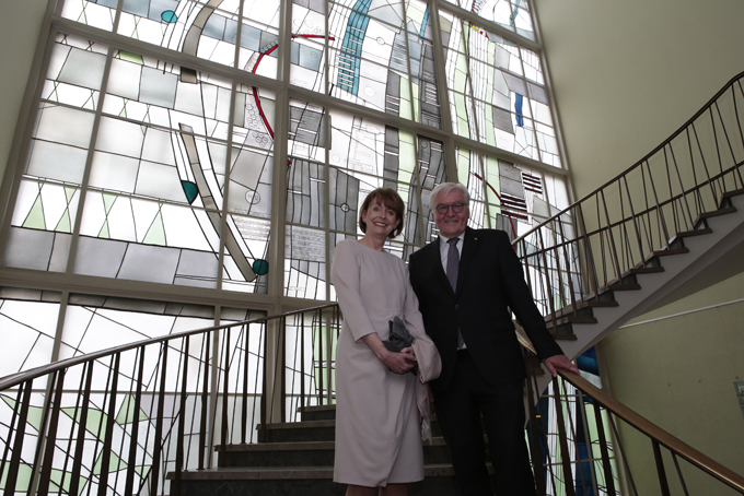 Während des Fußweges zum Kölner Dom nahm Oberbürgermeisterin Reker die Gelegenheit wahr, dem Staatsoberhaupt im Spanischen Bau des Rathauses das zwei Etagen überspannende, berühmte 13 mal neun Meter große "Geschichtsfenster" des 1990 verstorbenen bedeutenden Künstlers und Wahlkölners Georg Meistermann vorzustellen. Der Mataré-Schüler gehörte zu den bedeutendsten Künstlern in der noch jungen Bundesrepublik, von dem 1.000 bedeutende Glasfenster und Glaswände in Europa zu sehen sind. Während der Zeit des Nationalsozialismus musste er sein Studium abbrechen und erhielt Ausstellungsverbot. Das Fenster im Kölner Rathaus entstand 1952 und greift sowohl die Kölner Stadtstruktur als auch für die Stadtgeschichte wichtige Namen und Daten auf. Georg Meistermann lehrte als Professor an der Frankfurter Städelschule, an der Akademie der Bildenden Künste München und an der Kunstakademie Düsseldorf. Für sein Werk erhielt er unter anderem 1990 das Bundesverdienstkreuz mit Stern und Schulterband.