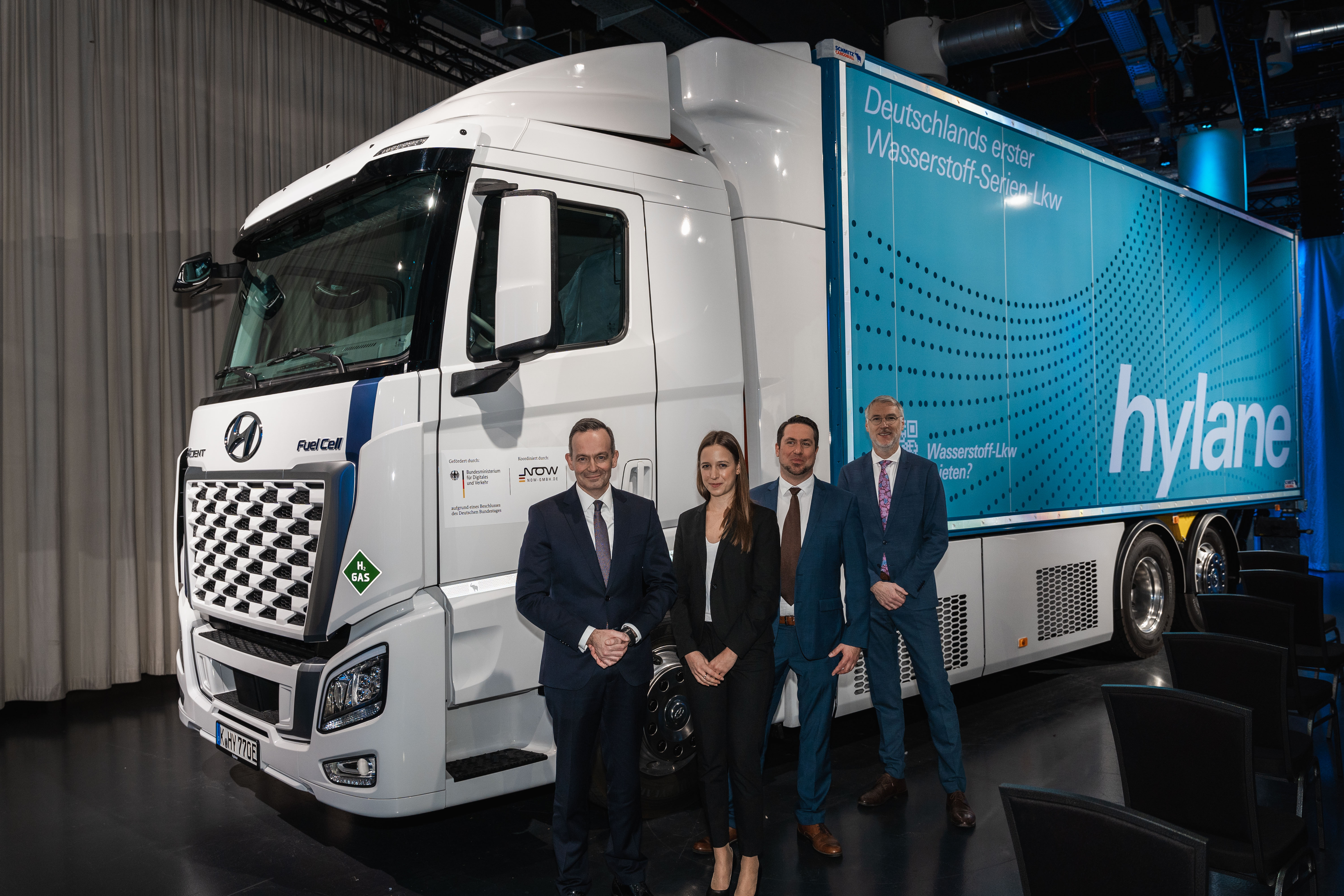 Dr. Volker Wissing (Bundesminister für Verkehr und digitale Infrastruktur), Sara Schiffer (Geschäftsführerin HyLane GmbH), Johannes Daum (Bereichsleiter Wasserstoff, alterna-tive Antriebe, NOW GmbH) und Kurt-Christoph von Knobelsdorff (CEO und Sprecher der NOW GmbH)