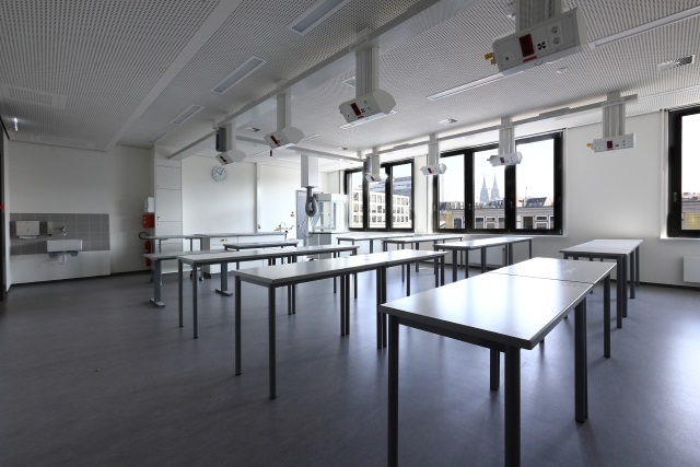 Die erste Fertigstellung aus dem Sonderprogramm war der Erweiterungsbau mit integrierter Dreifachturnhalle für das Hildegard-von-Bingen-Gymnasium in der Leybergstraße in Köln-Sülz.