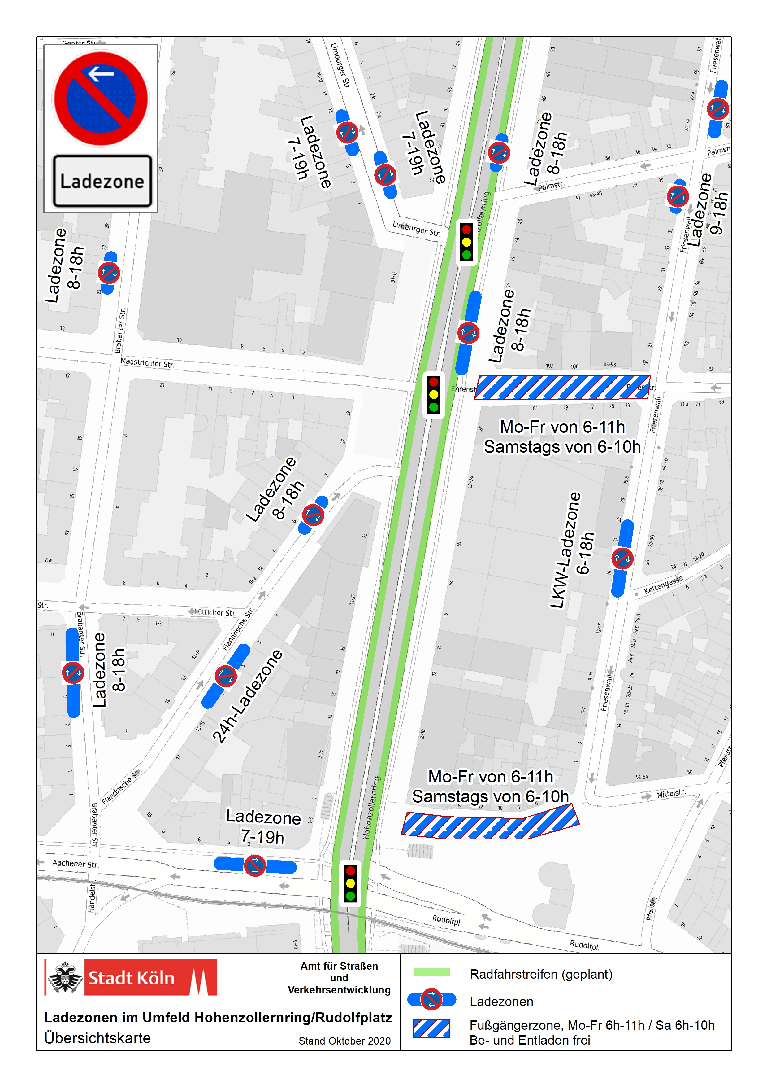 Der Abschnitt des Hohenzollernrings, auf dem der Radfahrstreifen eingerichtet wurde, durfte bis Sommer 2020 noch zeitweise für Ladetätigkeiten genutzt werden. Insbesondere Ladetätigkeiten am südlichen Hohenzollernring müssen seitdem über alternative Ladezonen abgewickelt werden, die auf dem angehängten Plan markiert sind.