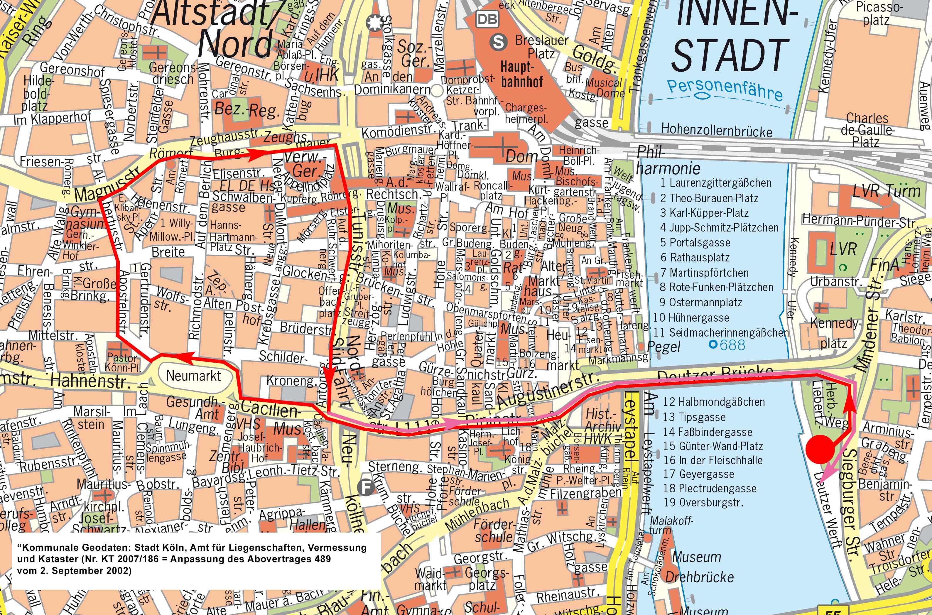 Der Veranstalter einer Versammlung mit dem Titel "TTIP und CETA stoppen – Für einen gerechten Welthandel" rechnet mit bis zu 30.000 Teilnehmern. Die Demonstration beginnt mit einer Auftaktkundgebung ab 11 Uhr auf der Deutzer Werft. Anschließend wer-den die Teilnehmer ab 13 Uhr folgenden Demonstrationsweg gehen: Deutzer Brücke – Pipinstraße – Cäcilienstraße – Neumarkt – Pastor-Könn-Platz – Apostelnstraße – Albertusstraße – Magnusstraße – Burgmauer – Tunisstraße – Cäcilienstraße – Deutzer Brücke – Deutzer Werft. Auf der Deutzer Werft wird anschließend eine Abschluss-Kundgebung stattfinden.
