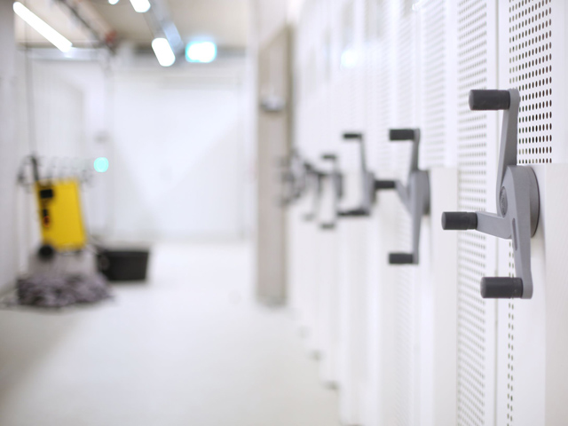 Der zweigeschossige Anlieferungsbereich grenzt direkt an den Werkstattbereich an, so dass Archivgut und Arbeitsmaterial nach eventueller Zwischenlagerung und entsprechender Bearbeitung in die Werkstätten und Magazinräume transportiert werden kann.