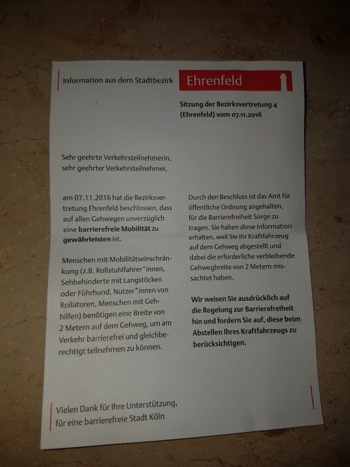 Im Stadtbezirk Ehrenfeld wurden Hinweiskarten an Fahrzeugen angebracht, auf denen der Fahrzeugführer aufgefordert wird, nicht auf dem Gehweg zu parken und einen Abstand von mindestens zwei Metern zur Hauswand einzuhalten. Die Hinweiskarten sind dem Layout der Stadt Köln angepasst und erwecken den Anschein, von der Stadt Köln verfasst und verteilt worden zu sein. Â