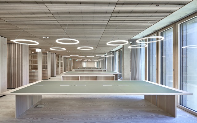 Die öffentlichen Bereiche im Erdgeschoss sowie der Lesesaal im ersten Obergeschoss mit ihren Holzverkleidungen aus weiß geölter Douglasie sind freundlich und einladend, vermitteln jedoch auch die notwendige Ruhe. Die Oberflächen aus Holz und Sichtbeton sind bestens geeignet, die hohen Anforderungen an Raumakustik und Raumklima zu erfüllen.