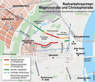 Die Stadt Köln gestaltet in der Kölner Innenstadt die Achse Christophstraße – Gereonstraße – Unter Sachsenhausen – An den Dominikanern zwischen der Fußgängerzone am Kaiser-Wilhelm-Ring und dem Kreisverkehr Marzellenstraße in beiden Fahrtrichtungen radverkehrsfreundlich um. Mit den ersten Vorarbeiten wird in der nächsten Woche begonnen.