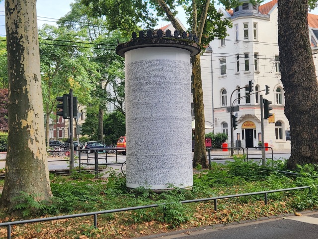 Bis Mitte Oktober 2025 steht mit dem "Seestück IV: Ein Meer aus Worten" ein Motiv der Künstlerin Hiltrud Gauf im öffentlichen Raum, das Menschen zum Nachdenken anregen soll. Für "Seestück IV" hat die Künstlerin hunderte Zeitungsmeldungen und Berichte handschriftlich abgeschrieben, die sich in einem dichten, überlagernden Gewebe aus Schriftzügen ganz dicht über die 360-Grad-Fläche der Säule herumziehen. Das Werk widmet sich damit den Bootsunglücken Geflüchteter im Mittelmeer. Einzelne Nachrichten verschwimmen in der Masse, wirken wie Wellen eines Meeres – erst bei genauerem Hinsehen offenbaren sich bruchstückhaft die Inhalte.