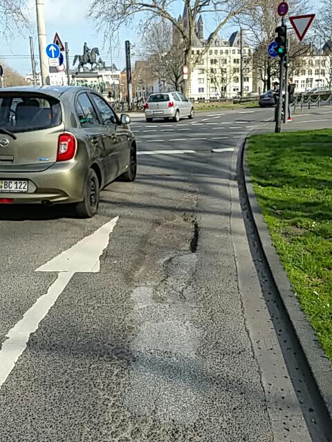 Das Amt für Straßen und Verkehrsentwicklung beseitigt im Rahmen einer Notfallmaßnahme eine Unfallgefahr auf der Fahrbahn auf der Straße "Heumarkt" in Höhe des Maritim Hotels in Fahrtrichtung Deutzer Brücke. Hier hat sich ein großes Schlagloch gebildet, das zunächst provisorisch ausgebessert wurde. Am Donnerstag, 19. März, und am Freitag, 20. März 2020, wird die Fahrbahn endgültig wiederhergestellt. Die rechte der beiden Fahrspuren muss dafür in Höhe der Arbeitsstelle während der Arbeitszeiten gesperrt werden. Die Arbeiten finden im Zeitraum zwischen 9 und 15 Uhr statt.