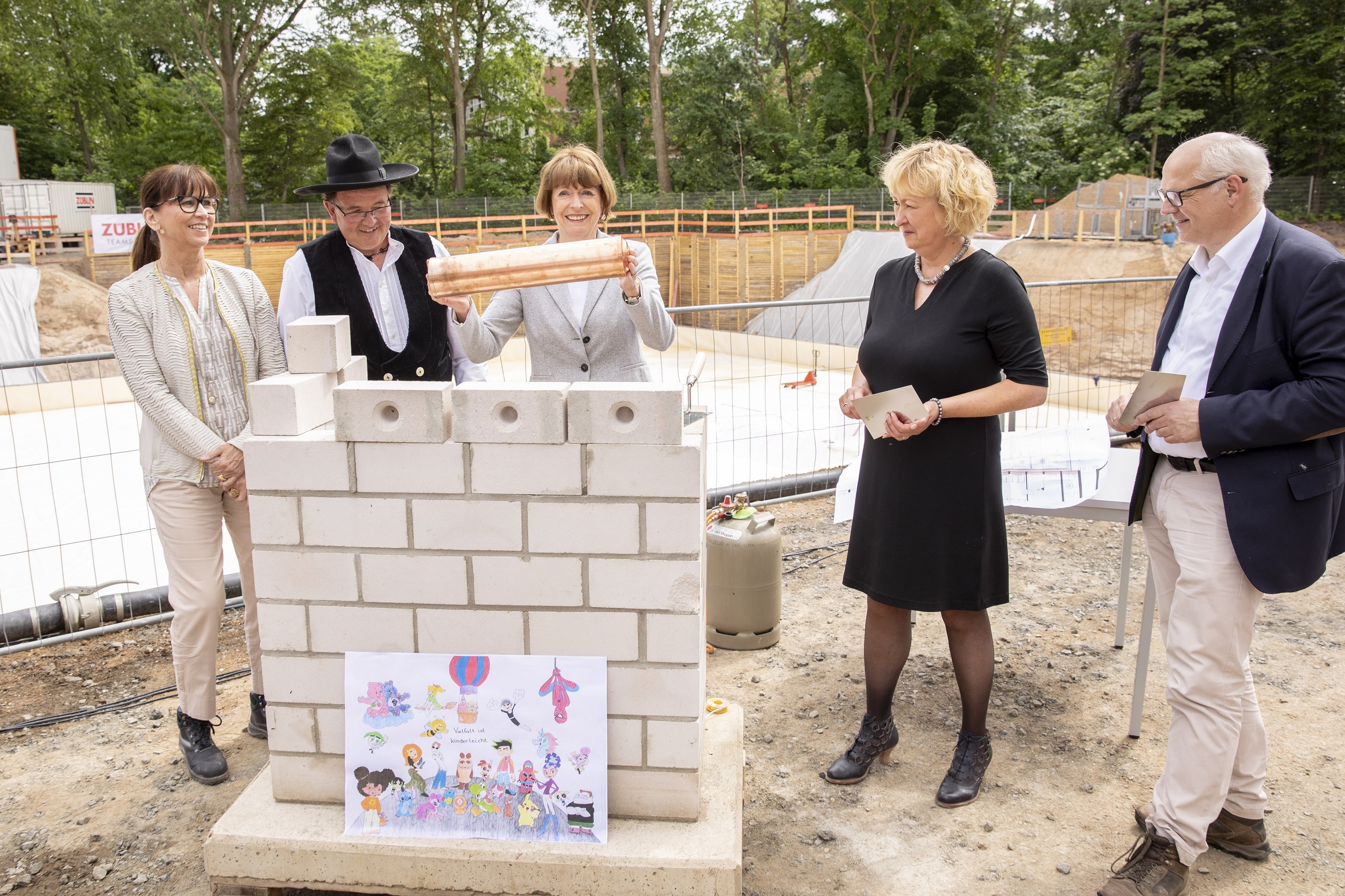 Das Barbara-von-Sell-Berufskolleg am Niehler Kirchweg in Köln-Nippes erhält einen Erweiterungsbau. Oberbürgermeisterin Henriette Reker legte auf dem Schul- und Baugrundstück gemeinsam mit dem Architekten Klaus Legner und Schulleiterin Renate Hartenstein am Dienstag, 17. Mai 2022, den Grundstein für den Neubau.