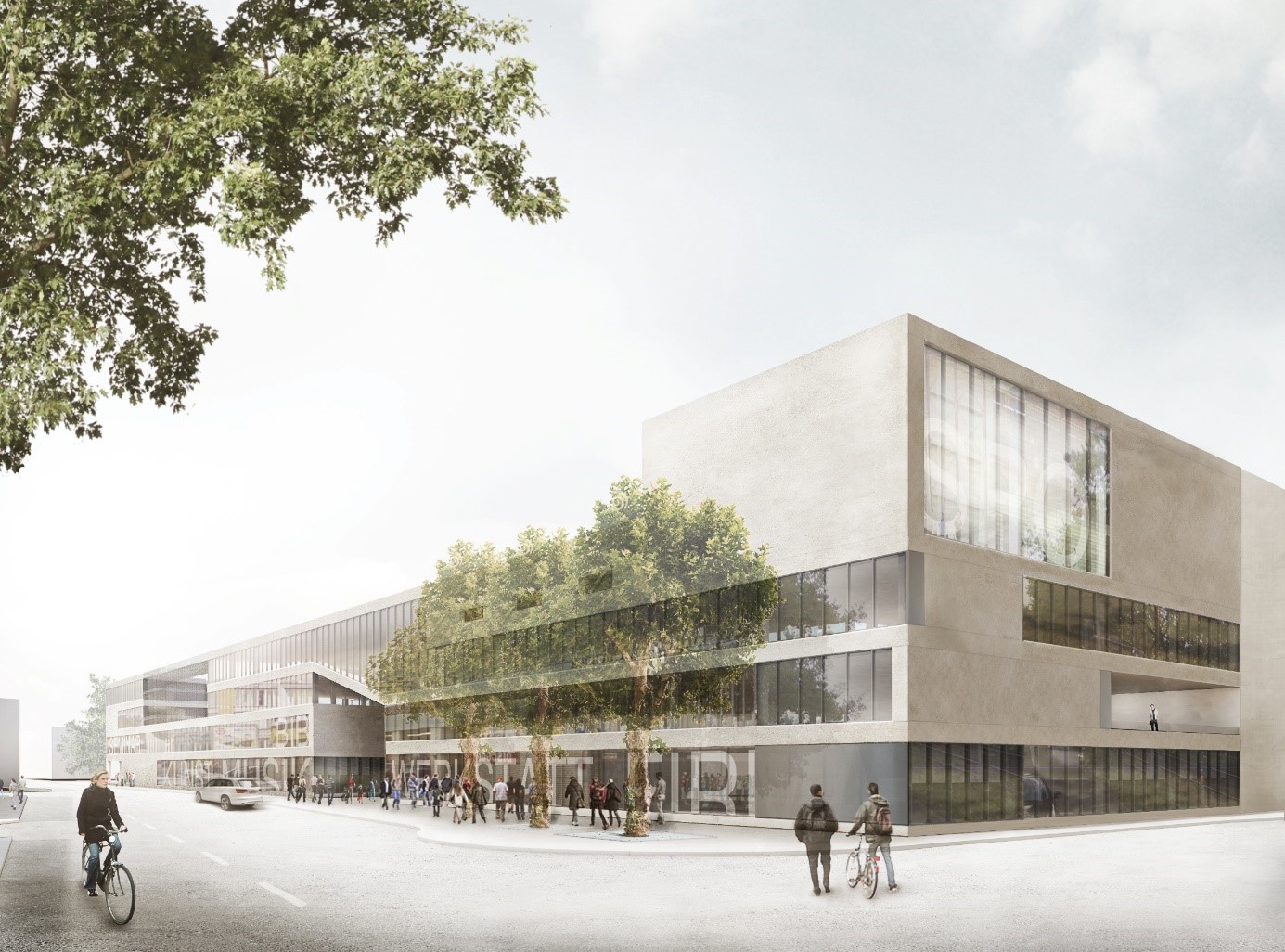 Überdachte Fahrradstellplätze mit direktem Zugang zur Eingangshalle wird es an der nord-westlichen Seite des Gebäudes geben. Weitere Fahrradstellplätze - insbesondere für den Primarbereich - werden entlang des Eingangs an der Vogelsanger Straße zum Platz angeordnet, der später öffentlich zugänglich sein wird. Die nicht-öffentliche Tiefgarage mit 39 Pkw-Stellplätzen wird von der Vogelsanger Straße in ausreichender Entfernung zum Kreuzungsbereich Gürtel erreichbar sein. Dort befinden sich auch weitere Stellplätze für Zweiräder, die über eine gesonderte Stufenrampe gefahrlos erreicht werden können.