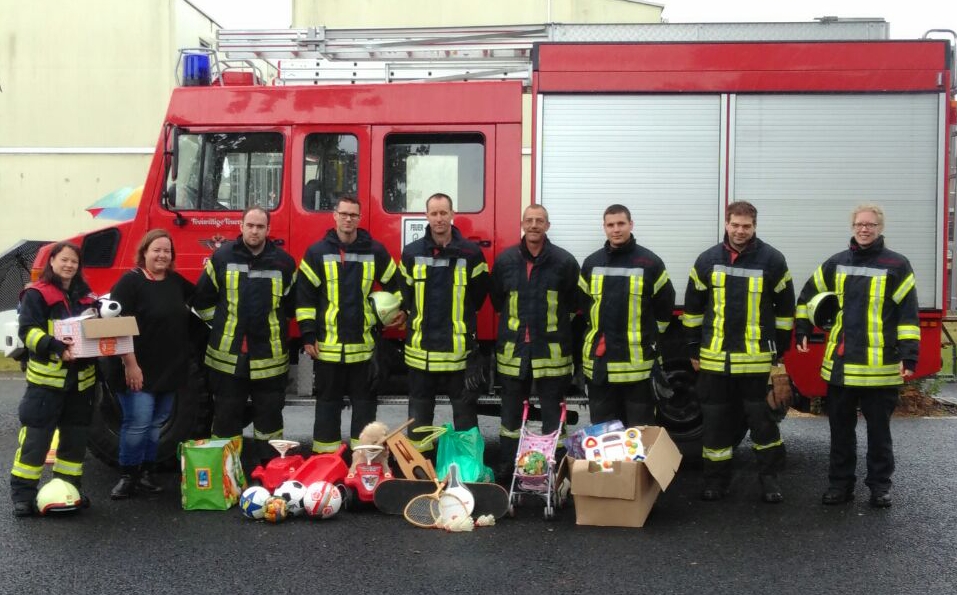 Mitglieder der Freiwilligen Feuerwehr verteilen Spielzeug an Flüchtlingsunterkunft