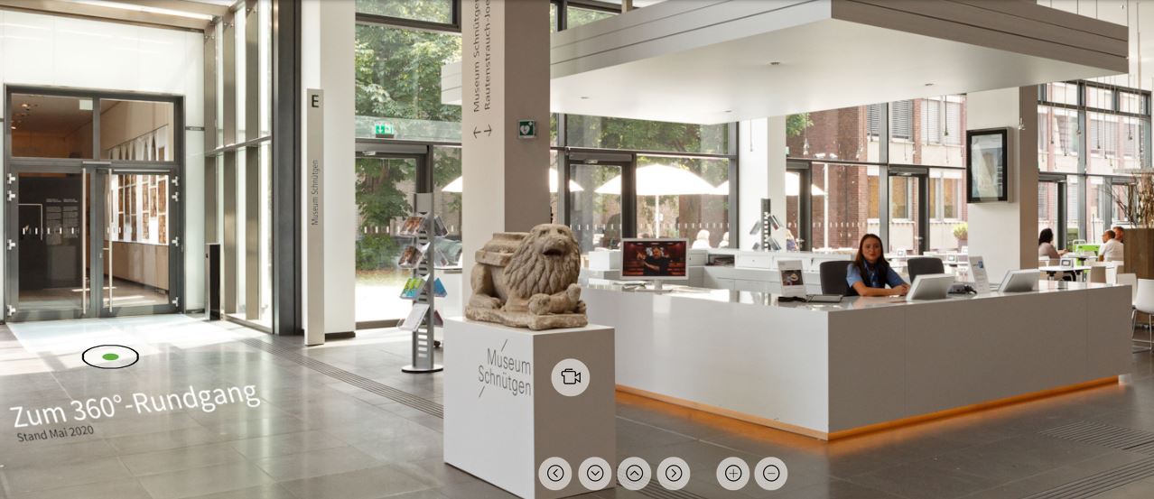 Das Museum Schnütgen ist seit Mittwoch, 29. April 2020, für virtuelle Besucherinnen und Besucher geöffnet. Mit Hilfe eines 360-Grad-Rundgangs kann man sich auf der Internetseite des Museums mit allen mobilen Endgeräten – darunter Smartphone, Tablet oder PC – auf einen Rundgang durch die ständige Sammlung begeben. Die audiovisuelle Begrüßung macht ein sprechender Portallöwe im Museumsfoye.