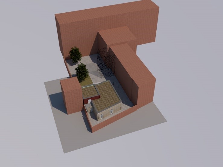 Die Küche wird für den Verpflegungsbedarf der Schule mit allen dazu notwendigen Personal- und Nebenräumen ausgestattet. So wird ein Müllplatz im überdachten hinteren Außenbereich angeordnet und ein Personalraum mit Umkleidemöglichkeit und Toiletten eingerichtet. Die Anlieferung erfolgt von vorne über einen separaten Liefereingang. Eine Rampe im Eingangsbereich ermöglicht, dass der Speiseraum barrierefrei erreicht wird und erleichtert zugleich die Anlieferung von Speisen und Lebensmitteln. Auf dem Dach wird ein Technikraum für Hausanschlüsse und für das Lüftungsgerät der Küche angeordnet, der von außen über das vorgelagerte Vordach zugänglich ist. Die Außenwände erhalten eine widerstandsfähige Fassade in Holzoptik. Dabei stellt der rotbraun verkleidete Fassadenbereich die optische Brücke zum denkmalgeschützten Altbau her.