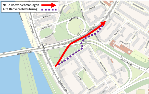 Auf der Auffahrt von der Siegburger Straße zum Gotenring in Köln-Deutz werden derzeit im Rahmen des Radverkehrskonzeptes Innenstadt auf etwa 300 Meter Länge Radverkehrsanlagen eingerichtet. Die Markierungsarbeiten sind weitgehend abgeschlossen. Dabei kommt der inzwischen vielfach umgesetzte neue "Kölner Standard" mit komfortablen Radfahrstreifen und XXL-Piktogrammen zum Einsatz. Diesen findet man unter anderem auch auf den Kölner Ringen, auf der Richard-Wagner-Straße oder auf der Siegburger Straße in Köln-Deutz. Dem Radverkehr steht hier nun eine sichere, komfortable und direkte Verbindung zwischen Rheinufer und Gotenring zur Verfügung.