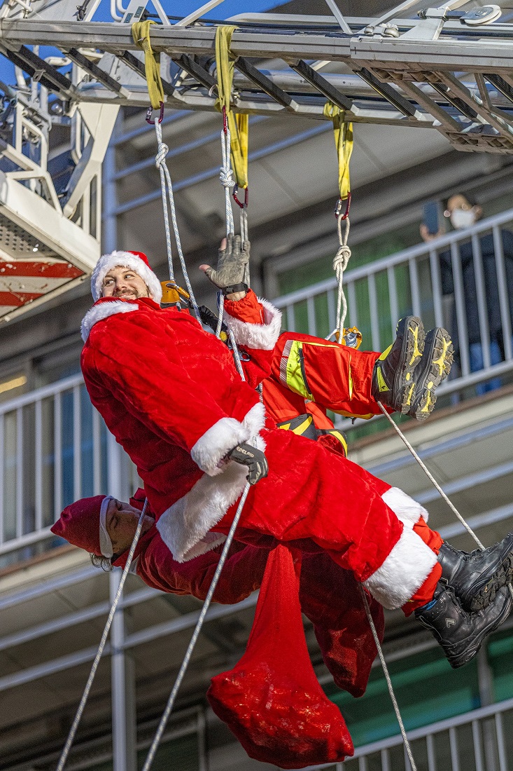 Eine Überraschung für die Kinder und Jugendlichen im Kinderkrankenhaus Amsterdamer Straße gab es am gestrigen Nikolaustag. Die Feuerwehr Köln baute vor der Kinderklinik zwei Drehleitern auf, von denen sich die als Nikoläuse verkleideten Höhenretter*innen auf die Balkone abseilten. Dort warteten Mitglieder der Jugendfeuerwehr, um gemeinsam mit den Höhenrettern Schokoladennikoläuse an die jungen Patient*innen zu verteilen. Die Nikolausaktion fand in diesem Jahr zum dritten Mal in Köln statt. Unterstützt wurde sie von der Freiwilligen Feuerwehr.