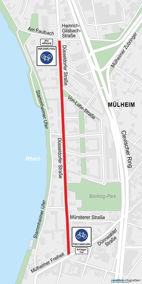 Besser auf dem Fahrrad unterwegs zwischen Stammheim und Mülheim und umgekehrt – auf dem zentralen Abschnitt der Düsseldorfer Straße (Mülheimer Freiheit bis Heinrich-Gilsbach-Straße) soll eine Fahrradstraße eingerichtet werden. Die geplante Fahrradstraße ist Teil der beschlossenen RadPendlerRoute 1 zwischen Leverkusen und Köln. Mit den RadPendlerRouten soll zukünftig das Fahrradfahren insbesondere für Pendler*innen aus dem rechtsrheinischen Köln und den angrenzenden Städten und Gemeinden attraktiver und sicherer werden.